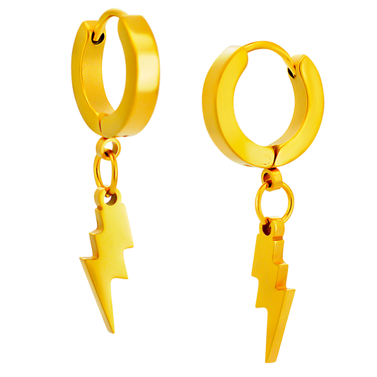 Hypoallergenic Stainless Steel Huggies Hoop Earrings with Dangling Lightning Bolt – Steel, Gold & Black Plated
