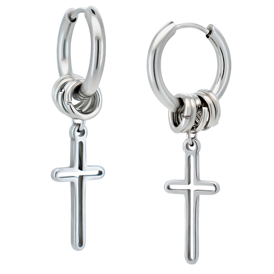 Hypoallergenic 316L Stainless Steel Huggies with 5 Rings & Dangling Cross – Steel Clip-On Earrings