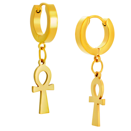 Hypoallergenic 316L Stainless Steel Dangling Ankh Cross Huggies – Steel, Gold, Black & Rainbow Plated Clip-On Earrings