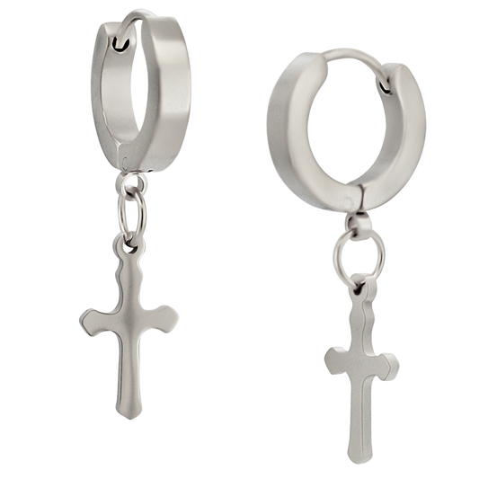 Hypoallergenic 316L Stainless Steel Dangling Cross Huggies – Steel, Gold, Black, Rose Gold & Rainbow Plated Clip-On Earrings